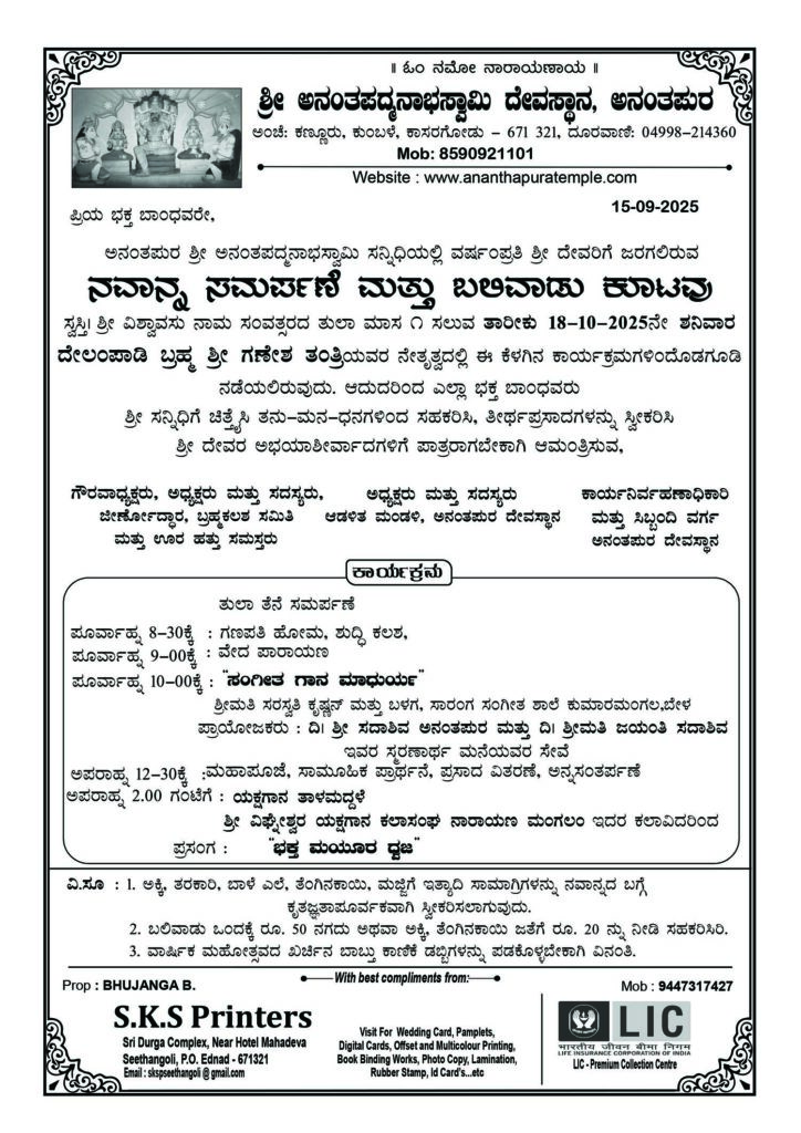 Ananthapura, 14th March 2025: Due to the renovation of the Namaskar Mantapa at Ananthapura Sri Ananthapadmanabha Swamy Temple, the pooja timings have been changed from 14th March 2025. The morning pooja will be held at 7.30 AM and the noon pooja at 8.30 AM. The sanctum sanctorum will close at 9.00 AM. The night puja